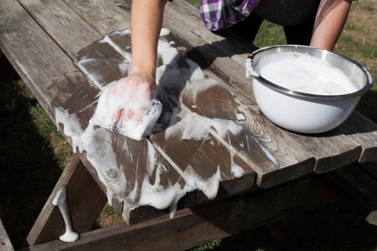 You can use that same spray paint in whatever finish you like. Begin by cleaning your picnic table with soapy water to remove dirt and grime.