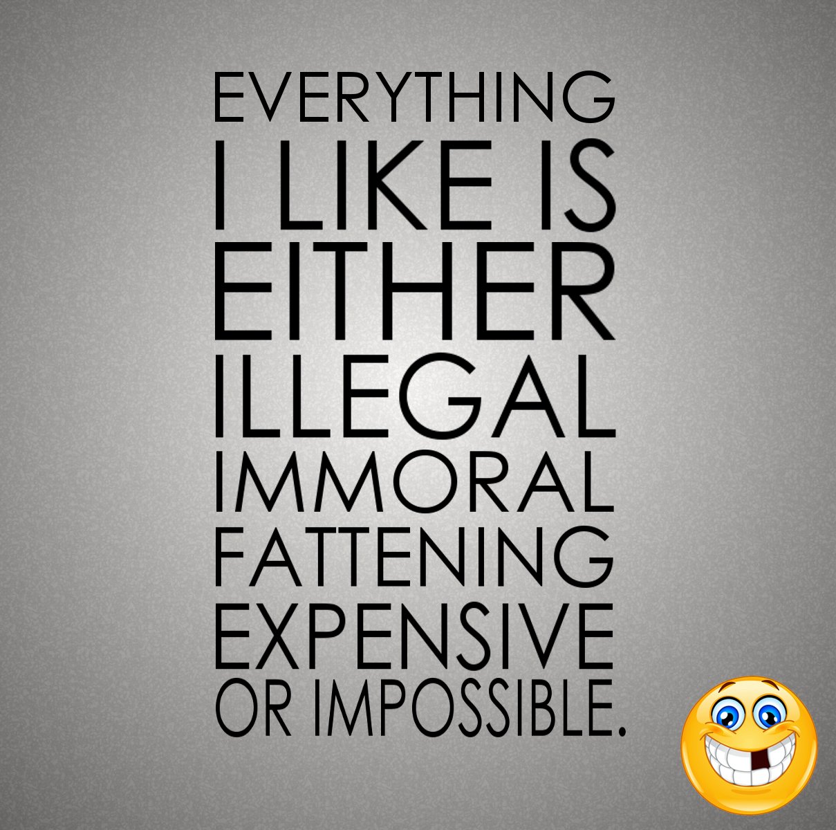 Everything i like is either illegal. Something is either illegal or it isnt there is no middle ground. All the things I really like to do are either illegal immoral or fattening. The kind of thing a savvy shopper would love to discover at a vinta.